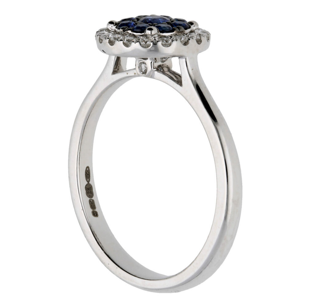Afabulous cluster ring favoured by the jewellers here at The Seylon Sapphire Company. Styled to mimic a halo design, nine rich blue sapphires are surrounded by a circle of dazzling white Sapphires. Crafted in 18ct white gold, this gorgeous ring could be presented as an engagement ring, anniversary ring or a Bride’s ‘something blue.